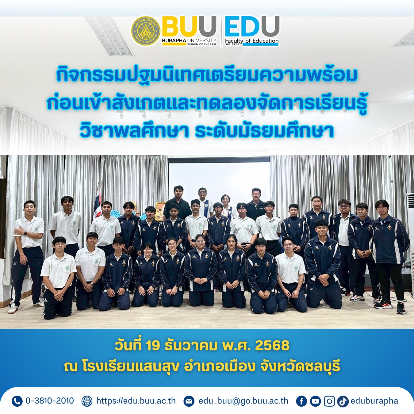วันที่ 19 ธันวาคม 2568 นิสิตสาขาวิชาพลศึกษาชั้นปีที่ 3 เข้าร่วมกิจกรรมเตรียมความพร้อมก่อนการเข้าสังเกตุและทดลองจัดการเรียนรู้วิชาพลศึกษา ระดับมัธยมศึกษา ณ โรงเรียนแสนสุข จังหวัดชลบุรี โดยมีผู้บริหารและคณะครูกลุ่มสาระการเรียนรู้สุขศึกษาและพลศึกษา ให้การต้อนรับและแนะแนวทางในการเข้าสังเกตการการเรียนรู้วิชาพลศึกษา